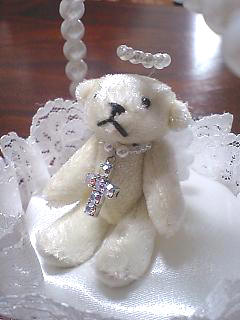 作ったとは言っても、クマのネックレスとか、天使の輪とか、下のクッションとか、ビーズをくっつけたり・・といった簡単なものだけ。